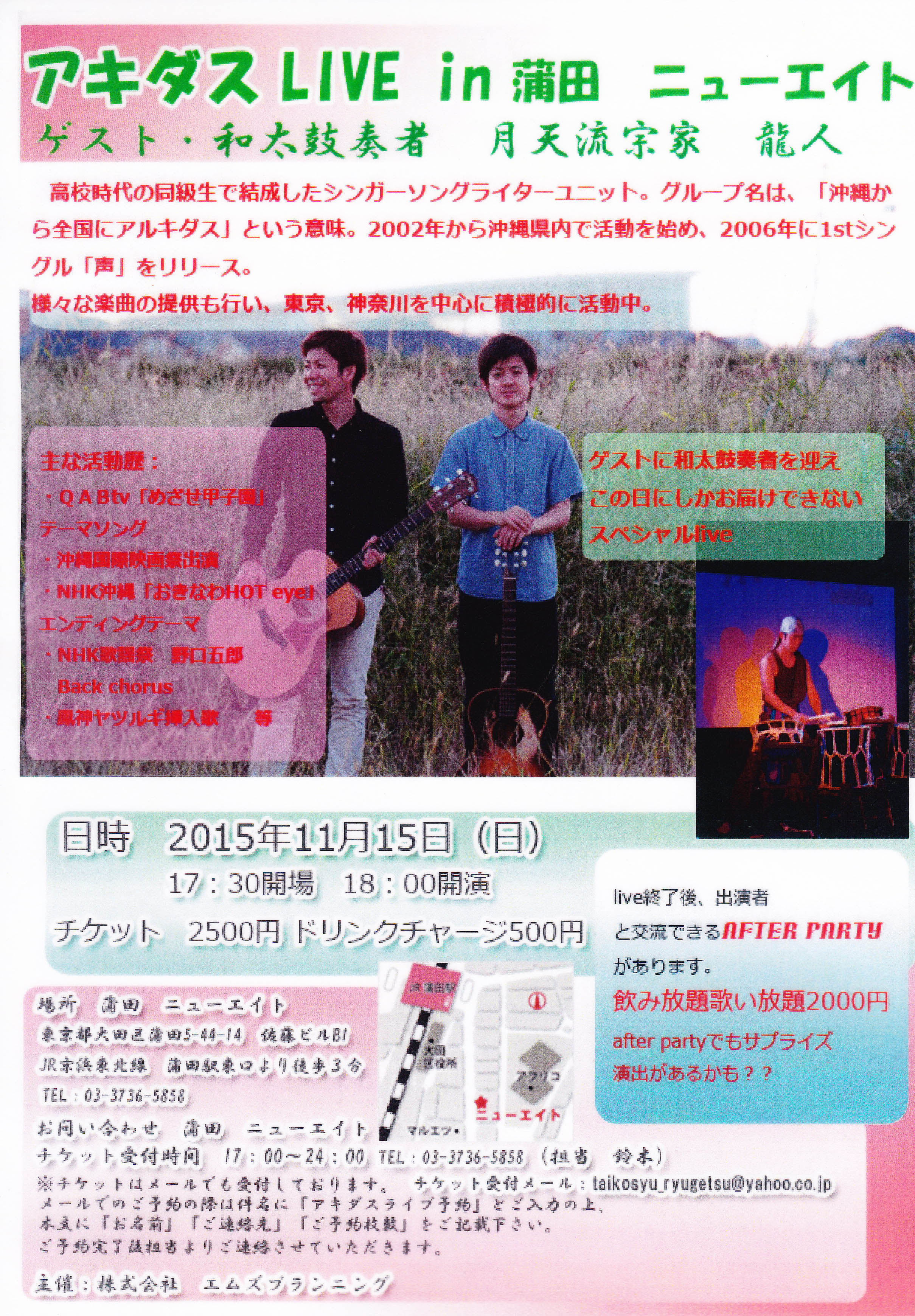 2015/11/12 アキダス LIVE in 蒲田 ニューエイト 2015.11.15 2015年11月15日 18:00開演 ゲスト 和太鼓奏者 月天流宗家 龍人 チケット 2500円 ドリンクチャージ 500円 【アキダス】 高校時代の同級生で結成したシンガーソングライターニュニット。 グループ名は「沖縄から全国にアルキダス」という意味。 2002年から沖縄県内で活動を始め、2006年に1stシングル「声」 をリリース。 様々な楽曲の提供も行い、東京、神奈川を中心に積極的に活動中。 « ボジョレーヌーヴォー 解禁!イベントのお知らせ 2015.11.19 ニュース&イベント予定一覧 ピンクパンサー 定期LIVE 2015.11.13 »
